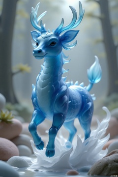duocaishuijindongwu,   (A mythical animal in the ancient Chinese classic "Shan Hai Jing", surreal, water qilin, a divine beast with a blue body and excellent water properties, a dragon head, and antlers. Running or jumping in the fairyland, it shows the agility and power of its divine beast. Full body image. Atmosphere colors are water blue and white. Realistic photography style, fantasy art aesthetics, movie lighting, Chinese bizarre aesthetics, romantic scenery, fine lines, Unreal engine rendering, ethereal rendering, fairyland background, natural light, 8K, exquisite details, beautiful lighting effects, dream engine.), (best quality,4k,8k,highres,masterpiece:1.2),ultra-detailed,(realistic,photorealistic,photo-realistic:1.37),ethereal glow,sharp focus,physically-based rendering,extreme detail description,professional,vivid colors,bokeh,nighttime,moonlight,shadows,rocks,crystals,glowing eyes,flowing fur,spiritual aura,ancient runes,enchanted forest,mythical,legendary,atmospheric lighting,haunting beauty,otherworldly atmosphere,celestial,unearthly,phantasmagoric,fantasy art,concept art,digital painting,HDR,UHD,studio lighting,ultra-fine painting,