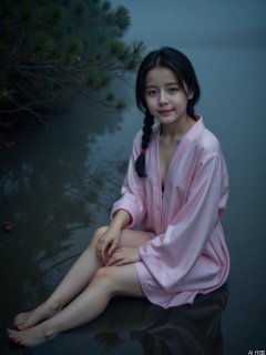Limuwang\(hubggirl)\,This is a high-resolution photo of a young East Asian woman taken in a mysterious and ethereal environment. A woman was surrounded by fog and extraordinary atmosphere in the water. He has black hair and a few braids on his face. He is wearing an elegant light pink robe with his legs, barefoot, with a hint of pink and white. Because of the water, the robe sticks to her. Her figure is slightly full, and her expression is delicate and considerate. Part of it is submerged in water, and the water has a misty quality, which gives the scene a dreamy quality. The background is a dark and hazy scenery. The overall atmosphere is mysterious and quiet, with a touch of extraordinary beauty.,,sitting