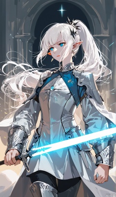 1girl, solo, long hair, bangs, blue eyes, hair ornament, long sleeves, holding, jewelry, closed mouth, standing, ponytail, weapon, white hair, cowboy shot, earrings, pointy ears, sword, holding weapon, armor, coat, glowing, holding sword, glowing weapon, glowing sword, elezen
