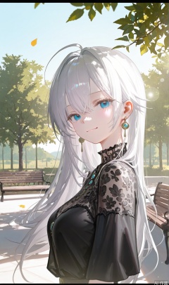 artist:tab_head,[artist:omone_hokoma_agm],[artist:fuzichoco],artist:misheng_liu_yin,[artist:mignon],{{artist:liduk}},{artist:konya_karasue},{{{artist:rolua}}},[[[[artist:freng]]]],[[artist:tianliang_duohe_fangdongye]],{artist:omone_hokoma_agm},year 2023,masterpiece,facing the lens,best quality,very aesthetic,extremely delicate and beautiful,huge filesize,amazing quality,32K UHD,shadow,(gold and silver lace) 1girl, solo, long hair, breasts, looking at viewer, smile, bangs, blue eyes, shirt, hair between eyes, jewelry, closed mouth, upper body, ahoge, grey hair, earrings, outdoors, sky, day, from side, tree, black shirt, floating hair, leaf, letterboxed, wind, lens flare, bench