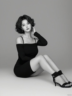 KDF, Black and white photograph of a woman sitting on the ground, leaning back on her hands. She has short, wavy hair and is wearing a tight, long-sleeved black dress that accentuates her curves. Her legs are crossed, and she is wearing black high-heeled sandals with ankle straps. The background is plain and white, drawing focus to her. She has a neutral expression and is looking directly at the camera. The lighting is soft, creating gentle shadows. The image has a modern, stylish aesthetic.