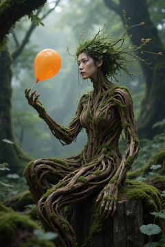 This is a surrealist photograph with dynamic visuals and cinematic quality.,A woman sits on a tree stump in the forest,entwined with vine growths,roots,and branches,holding a water balloon in her left hand,gazing intently at it.,