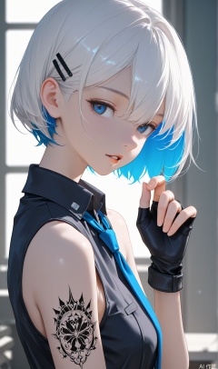 1girl, solo, looking at viewer, short hair, bangs, blue eyes, shirt, hair ornament, gloves, hair between eyes, bare shoulders, blue hair, upper body, white hair, multicolored hair, parted lips, necktie, sleeveless, black gloves, hairclip, collared shirt, indoors, fingerless gloves, from side, two-tone hair, looking to the side, black shirt, sleeveless shirt, tattoo, blue necktie, colored inner hair