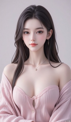 1girl, solo, long hair,breasts,Cleavage, radiating warmth, looking at viewer, hazel eyes, wrapped in a soft cardigan, bare neck, long, straight hair, upper body, black hair, a friendly expression, delicate pendant, inviting eyes, open - fronted, knitted cardigan, realistic, in a pastel shade.