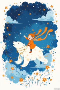 Splash-ink illustration style, a little girl flies on the back of an ice bear, surrounded by flowers and clouds in the night blue sky, the polar bear raises its head high around her, creating a flat illustration style. It features orange color on a white background and showcases charming characters. Wearing lights, they create dreamlike scenes,