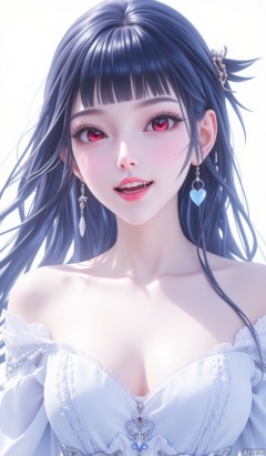 masterpiece,very aware,highres,absurdres,newest,best quality,high quality,loli,petite,chromatic_aberration,Light Blue Theme,  1girl, solo, long hair, jewelry, earrings, looking at viewer, red eyes, open mouth, smile, collarbone, heart, breasts, black hair, fangs, simple background, white background, cleavage, blush, white dress, ear piercing, teeth,  upper body, blunt bangs, piercing, dress,  pointy ears, heart earrings,