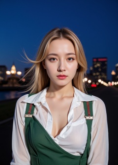 The image is a portrait of a young woman with long blonde hair. She is standing in front of a city skyline at night, with the lights of the city visible in the background. The woman is wearing a green dress with a white collar and a white blouse underneath. Her hair is blowing in the wind, and she is looking directly at the camera with a serious expression on her face. The sky is a deep blue, and the overall mood of the image is peaceful and serene.