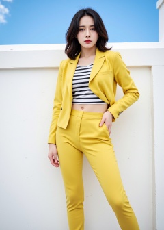 The image shows a young woman standing in front of a white wall with a blue sky in the background. She is wearing a bright yellow suit with a black and white striped shirt underneath. The suit has a high collar and long sleeves, and she is also wearing white sneakers. Her hair is styled in loose waves and she has a serious expression on her face. The woman is posing with one hand on her hip and the other resting on her thigh. The overall mood of the image is casual and relaxed.