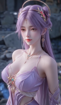 (8k, RAW photo, best quality, masterpiece:1.2),solo,pov,(super realistic, photo-realistic:1.3), ultra-detailed, extremely detailed cg 8k wallpaper,hatching (texture),skin gloss,light persona,(crystalstexture skin:1.2), (extremely delicate and beautiful), (white skin:1.2),ultra realistic 8k cg, flawless, clean, masterpiece, professional artwork, famous artwork, cinematic lighting, cinematic bloom, perfect face, beautiful face, fantasy, dreamlike, unreal, science fiction, lace, lace trim, lace-trimmed legwear, luxury, jewelry, diamond, pearl, gem, sapphire, ruby, emerald, intricate detail, delicate pattern, charming, alluring, seductive, erotic, enchanting, hair ornament, necklace, earrings, bracelet, armlet,halo,,(((Best quality, masterpiece, ultra high res, (photorealistic:1.4), raw photo, 1girl, wet clothes, )))1girl,arms behind back,long hair, solo, (((very_long_hair))),bare_shoulders,purple hair, long dress,hair ornament,pov,(full shot), (breasts,medium_breasts, cleavage:1.2),looking_at_viewer,