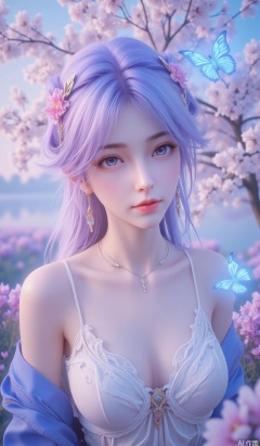 Realism,veil,unreal,sunlight,backlighting,glowing,petals,shadow,light,figure light,dream,float light, amazing quality, very aesthetic, absurdres,Dundar effect,flowers covering half of the painting,delicate plant details,dream, soul, (fluorescence), (flying translucent blue butterfly) masterpiece,best quality,high quality,(colorful),1girl,solo,long hair,looking at viewer,blue eyes,upper body,head tilt,blue theme,jacket,closed mouth,earrings,bare shoulders,off shoulder,white hair,jewelry,strap slip,collarbone,camisole,blue background,backlighting,blue hair,pink background,multicolored hair,gradient background,simple background,hair between eyes,expressionless,spaghetti strap,blue jacket,shirt,sidelocks,glowing,pixie cut in vibrant lavender,ice purple eyes,dressed in a romantic bohemian dress with layered lace and a floral crown,in a field of wildflowers under a pastel sunset with butterflies fluttering,hle