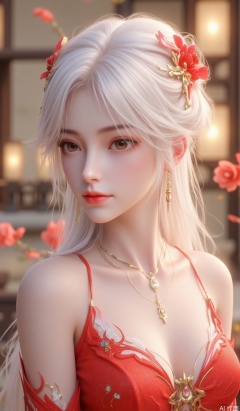 1girl, solo, breasts, looking at viewer, hair ornament, dress, jewelry, flower, white hair, earrings, parted lips, hair flower, from side, lips, petals, rose, chinese clothes, red flower, red rose, red lips,hle