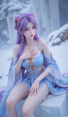 Realistic,Ultra clear, wallpaper, 8k, masterpiece, 1girl, solo, long hair, blue eyes, hair ornament, dress, bare shoulders, large chest, jewelry, sitting, purple hair, earrings, bare legs, blue dress, ice, crystal, horns, single horn, hand over heart,hle,huolinger