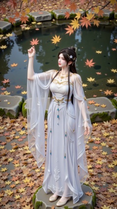 Action: She stands on a stone. Moss grows all over the stones. This lady's posture is elegant and full of vitality. She gently raised her hands and touched the maple leaves falling in the air. This action not only showcases the softness of the woman, but also seems to interact with the falling maple leaves, as if feeling the scent of autumn, giving a sense of agility and elegance, as if she will fly with the autumn wind and fallen leaves in the next moment.