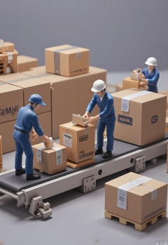 WSCJ, Photograph of a miniature e-commerce warehouse scene with tiny figurines of workers in blue uniforms, packing boxes on a conveyor belt. The figurines are intricately detailed, with various expressions showing focus and efficiency. The background is a soft gradient of grays, creating a modern and industrial atmosphere. The boxes are labeled with colorful brand logos, adding pops of color. The lighting is bright and even, illuminating every detail. The composition emphasizes the organized chaos of a busy warehouse.