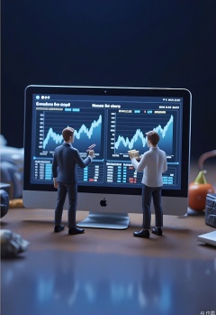 WSCJ, Photograph of a miniature e-commerce data analytics center with tiny figurines of analysts looking at charts and graphs on large screens. The figurines are focused and analytical, and the screens display complex data visualizations. The background is a dark blue, creating a professional and high-tech atmosphere. The lighting is bright, with a slight glow from the screens. The overall mood is data-driven and strategic, capturing the importance of analytics in e-commerce.