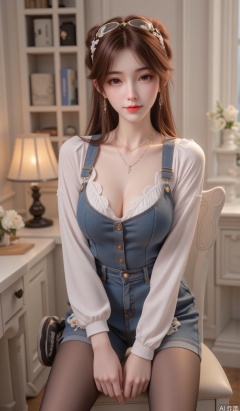 Realistic,Flower headband,The white flowers on the clothes,ruffled,sides up,ndoor,clavicle,A happy smile,mature women,Youth and vitality,thigh,Cleavage of breast Chestnut colored hair,Amber eyes,goggles, (Overall:1.2),(sneakers:1.2),long hair,(black pantyhose:1.2),on chair,hle