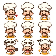 JSBQ, A collection of digital illustrations of a man with a mustache and a friendly expression, wearing a chef's hat. He is portrayed in nine different expressions and poses, embodying emotions like joy, creativity, and satisfaction. The background is a plain white, highlighting the vibrancy of his hat and apron. The art style is culinary-inspired, with food-themed details and warm hues. His hat sits jauntily on his head in each illustration, adding to his cheerful demeanor. The overall mood is warm and inviting.