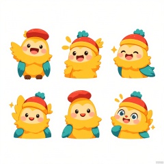 DWBQ, A digital illustration of a cheerful, parrot with vibrant feathers, arranged in a 3x3 grid, each cell showcasing a different expression: happy squawking, playful preening, curious exploring, content perching, surprised widening (of eyes), and singing melodiously. The parrot has a tiny red and yellow hat on its head. The background is white. The style is lively and colorful, with bold patterns and bright hues.