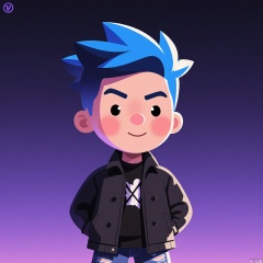 DDY, A digital artwork of a teenage boy with spiky blue hair, wearing a black leather jacket and ripped jeans. He has a rebellious expression with a smirk, and his eyebrows are raised. The background is a gradient night sky transitioning from deep purple at the top to electric blue at the bottom. The art style is cartoony and edgy, with sharp angles and a glossy texture. The artist's signature "D. N" is in the top right corner.