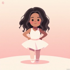 DDY, A digital drawing of a young girl with curly black hair and a ballet dancer's poise, wearing a white tutu and pink pointe shoes. She has a graceful expression with a soft smile, and her arms are extended in a delicate pose. The background is a gradient ballet studio transitioning from pale pink at the top to ivory at the bottom. The art style is cartoony and elegant, with flowing lines and a smooth texture. The artist's signature "L. V" is in the top right corner.