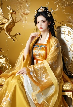 GFHF, Digital artwork of a regal queen with upswept black hair accented with a phoenix hairpin, dressed in a majestic gold hanfu with dragon embroidery over a velvet gown, sitting on a golden throne. The background features opulent Chinese imperial patterns and a phoenix motif. Rich, royal tones, authoritative and noble aura. The queen has a commanding presence, with one hand resting on the throne arm.