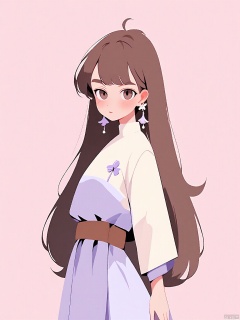 JJMX, Minimalist artwork of a young woman with long, brown hair and a purple streak, donning a cream and lavender dress with a brown belt. She has gentle, dreamy eyes and a tiny lavender flower pinned to her dress. The background is a soft pink hue. The style is delicate and ethereal, highlighting the character's serene expression and elegant outfit.
