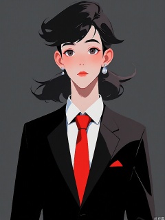 JJMX, Minimalist portrait of a young man with a ponytail and a silver streak, wearing a sleek black and silver suit with a red tie. He has confident, charismatic eyes and a small silver cufflink. The background is a sophisticated charcoal gray. The style is classy and modern, accentuating the character's polished presence and stylish ensemble.