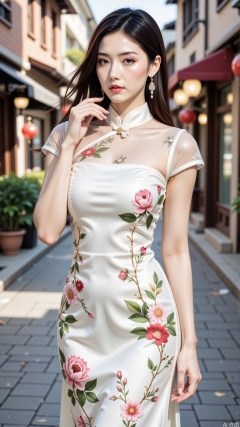 In the image, the woman is adorned in a white cheongsam that exudes a sense of freshness and elegance. White cheongsams are renowned for their purity and nobility, often associated with weddings or formal occasions. They symbolize innocence and new beginnings, imparting a sense of tranquility and peace. The floral patterns on the cheongsam are brought to life with exquisite embroidery, adding a touch of vivid color and artistic flair to the garment.The design of this cheongsam skillfully blends traditional and contemporary styles, with sheer sleeves and a sheer neckline lending a light and airy feel to the overall look, while the tailored fit beautifully accentuates the female form. The urban street scene in the background infuses the image with a modern metropolitan vibe, making the woman in the white cheongsam even more eye-catching. The overall composition evokes a sense of purity and harmony, as if time has softened in this moment, allowing one to be captivated by the perfect blend of classical beauty and modern fashion.