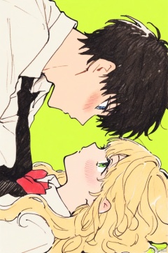 1boy, 1girl, blonde hair, long hair, shirt, necktie, blush, green eyes, white shirt, short hair, looking at another, blue eyes, simple background, black necktie, collared shirt, green background, bow, profile, bangs, looking up, on back, hetero, lying, eye contact, upper body
