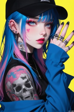 1girl, solo, long hair, looking at viewer, blue eyes, long sleeves, hat, jewelry, blue hair, jacket, upper body, pink hair, multicolored hair, earrings, parted lips, hand up, necklace, off shoulder, nail polish, two-tone hair, lips, fingernails, sleeves past wrists, eyelashes, black headwear, tattoo, makeup, piercing, ring, blue jacket, ear piercing, black nails, baseball cap, yellow background, eyeshadow, arm tattoo, shoulder tattoo, multiple rings,