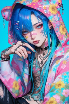 solo, long hair, looking at viewer, blue eyes, hair ornament, long sleeves, 1boy, jewelry, blue hair, flower, male focus, choker, hairclip, pants, hood, necklace, nail polish, tattoo, piercing, floral print, ring, ear piercing, bandaid, hood up, bandaid on face, bandaid on nose, sticker, lip piercing, flower tattoo,