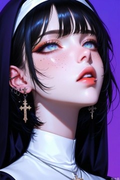 s1girl, solo, short hair, bangs, blue eyes, simple background, black hair, jewelry, earrings, parted lips, necklace, mole, lips, eyelashes, makeup, piercing, cross, ear piercing, portrait, freckles, purple background, nun, habit, cross earrings