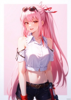 1girl, solo, long hair, breasts, looking at viewer, bangs, large breasts, shirt, gloves, navel, bare shoulders, brown eyes, white shirt, weapon, pink hair, pantyhose, red hair, parted lips, detached sleeves, shorts, sleeveless, midriff, collared shirt, fingerless gloves, lips, short shorts, black shorts, sunglasses, eyewear on head, red gloves,mai,beauty girl, shiranui mai
