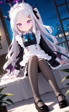 1girl, solo, looking at viewer, long sleeves, dress, bow, sitting, full body, outdoors, frills, shoes, alternate costume, footwear, apron, maid, maid headdress, night, white apron, mary janes, maid apron, enmaided, pantyhose,hina/(/blue archive/)
