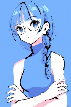 1girl, solo, long hair, looking at viewer, bangs, blue eyes, shirt, bare shoulders, jewelry, closed mouth, blue hair, upper body, braid, earrings, glasses, sleeveless, blunt bangs, nail polish, fingernails, sleeveless shirt, single braid, turtleneck, blue background, piercing, crossed arms, ring, ear piercing, round eyewear,