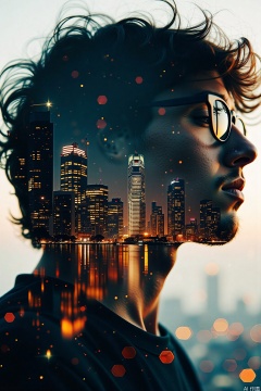 jzbj,double-exposure, Under double - exposure, the image is steeped in a mysterious atmosphere. The man wearing glasses, with his profile set against the city night view, appears deep and mysterious. The high - rise buildings are brightly lit, twinkling like mysterious codes, and the intertwined lines seem to hide unknown veins. The whole scene is like an entrance to the mysterious depths of the city.