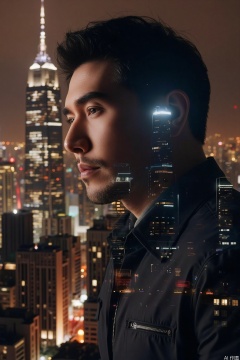 csns,fex,mature men, his profile set against the city night view, appears deep and mysterious. The high - rise buildings are brightly lit, twinkling like mysterious codes, and the intertwined lines seem to hide unknown veins. The whole scene is like an entrance to the mysterious depths of the city,shot with a Canon 5D Mark IV at f/1.8, 1/100s. The tone is elegant, with a slight retouch effect to highlight the portrait quality.,jzbj,double-exposure