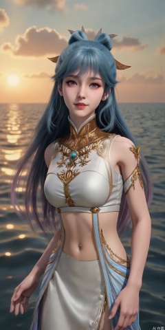 best quality, masterpiece, realistic,cowboy_shot,(Good structure), DSLR Quality,Depth of field,kind smile,looking_at_viewer,Dynamic pose, 1girl, solo, long hair, , looking at viewer, skirt, hair ornament, bare shoulders, jewelry, , , earrings, outdoors, midriff, water, necklace, lips, crop top, grey eyes, leaning forward, ocean, white skirt, strapless vest, sunset, sun,wangdonger,blue hair