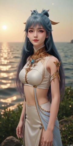 best quality, masterpiece, realistic,cowboy_shot,(Good structure), DSLR Quality,Depth of field,kind smile,looking_at_viewer,Dynamic pose, 1girl, solo, long hair, , looking at viewer, skirt, hair ornament, bare shoulders, jewelry, , , earrings, outdoors, midriff, water, necklace, lips, crop top, grey eyes, leaning forward, ocean, white skirt, strapless vest, sunset, sun,wangdonger,blue hair
