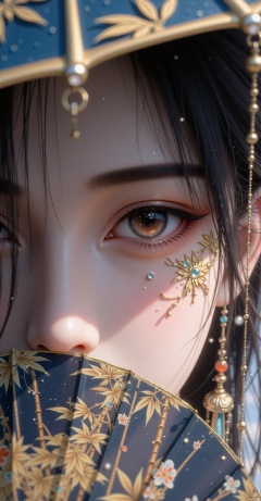 Studying abroad,misty,misty,studying abroad,fine clouds in the sky,misty,misty,a lady,misty,seeing the eyebrows,eyes,and skin clearly,(face painting,face tattoo)A close-up of a woman's eyes.Half of the woman's face is obscured by an umbrella embroidered with a golden bamboo forest,rain,dew,and flowers.The umbrella is supported by a gold rim hanging from the right side of the umbrella frame.The light in the foreground is soft,creating an eye-level effect.Black hair.
