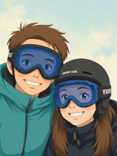 cpppppi, This is a digital drawing in an anime style featuring two smiling children, a boy and a girl, wearing ski goggles and helmets labeled "Van Bergen." The boy has light brown hair and wears a teal jacket, while the girl has brown hair and a black jacket. Both have blue-tinted goggles. The background is a soft, cloudy sky. . Ghibli character style,