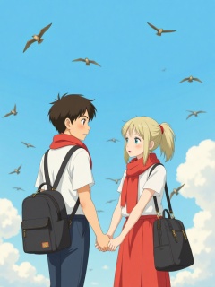 cpppppi, sfw, sky, birds, 1boy, day, brown eyes, 1girl, open mouth, red eyes, sky blue eyes, short hair, holding hands, short sleeves, blonde hair, red scarf, red skirt, black hair, long hair, brown hair, looking at another, clouds, school uniform, birds of prey, birds of prey, short ponytail, scarf, backpack, skirt, bag, holding, school bag, flying, open clothes . Ghibli character style,