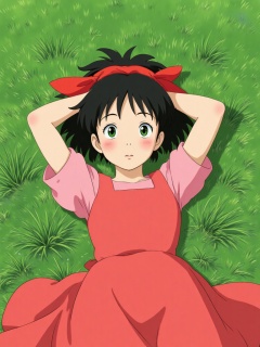 cpppppi, sfw, 1girl, red bow, short hair, on back, looking at viewer, short sleeves, bow, grass, solo, arms behind head, on grass, black hair, hair bow, the secret world of arrietty, arms up, lying, pink dress, dress, the secret world of arrietty (movie), 1980s (style), dress overalls, green eyes, black eyes, looking up, overalls, hairband, 1other . Ghibli character style,