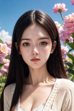 1girl, solo, sky, flower, closed mouth, looking at viewer, upper body,