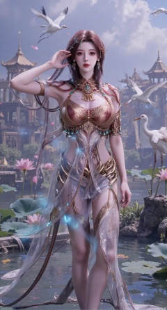 SFW,(masterpiece:1.2),best quality,1girl,solo,long hair,long dress,celestial maiden in flowing tulle gown levitates above lotus pond, ethereal mist trails from hair ribbons, mythical Penglai paradise emerges through clouds with glowing pavilions, translucent bioluminescent lotus blooms, flock of cranes gliding over water surface, ultra HD with soft 3D rendering, morning light filters through mist, falling petal rain, intricate details on scale-patterned fabric and lotus veins.(huge breasts:2.99),(full breasts:2.99),XanmiaoyiY,XhuolingerHHY,XwangqiuerKQW,Xxuenv,Xnanqiuqiu