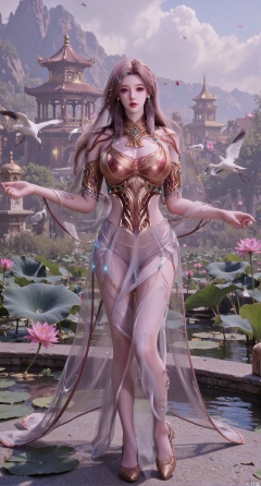 SFW,(masterpiece:1.2),best quality,1girl,solo,long hair,long dress,celestial maiden in flowing tulle gown levitates above lotus pond, ethereal mist trails from hair ribbons, mythical Penglai paradise emerges through clouds with glowing pavilions, translucent bioluminescent lotus blooms, flock of cranes gliding over water surface, ultra HD with soft 3D rendering, morning light filters through mist, falling petal rain, intricate details on scale-patterned fabric and lotus veins.(huge breasts:2.99),(full breasts:2.99),XanmiaoyiY,XhuolingerHHY,XwangqiuerKQW,Xxuenv,Xnanqiuqiu