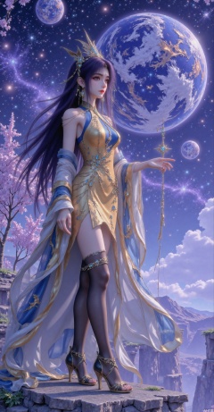 The image depicts a quiet and ethereal scene with the background of the universe. A woman with long and flowing black hair stood gracefully on the rock outcrop, her blue and yellow dress was decorated with golden patterns, glittering. She was surrounded by a network of glowing golden threads that seemed to emanate from her outstretched hand, holding a small star-shaped object. The background has a stunning view of outer space, with a large planet resembling Earth, surrounded by smaller celestial bodies and a galaxy that lie all over the sky. On the left, there are exquisite cherry blossom trees, and their pink flowers add natural flavor to the cosmic environment. The overall atmosphere is one of the mixed elements of tranquility and miracle, fantasy and the universe. With black mesh lace design, the surface of the shiny stockings, decorated with jacquard texture and gold high heels, it looks particularly noble and is high heels.