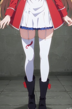 1girl, solo, long hair, brown hair, thighhighs, long sleeves, dress, very long hair, standing, jacket, boots, indoors, black footwear, white dress, white thighhighs, zettai ryouiki, garter straps, short dress, red jacket, head out of frame, lower body,,,(Thin legs:1.6)
