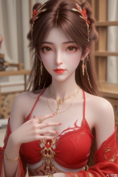masterpiece,best quality,Realism,hle,huolinger,1girl, solo, long hair, looking at viewer, Brown hair,Eye shadow,Eyelashes, Red strapless sweater,,Bracelet,Necklace,jewelry, nail polish, sweater, lips, fingernails,ring, curtains, realistic, Red gilded nails,