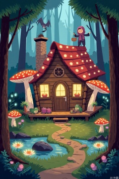 Cartoon illustration,Cabin construction: A giant red umbrella with white spots serves as the roof, while luminous spore lanterns hang from the drooping folds of white-spotted mushrooms. The chimney is crafted from crooked chantrelles, emitting rainbow smoke rings. The porch is covered in bark, and the door handle is a spiral snail shell.🌼The surrounding ecology:A moss carpet covers the ground, dotted with bell flowers that chime like clocks. Fluorescent blue mushrooms light the path. In the pond, lotus leaves float like dinner plates, supporting a family of frogs enjoying tea.🧚Scene of life:A cloaked mole baker distributes pine cone bread through the window. On the roof, a spider tailor weaves curtains from spider silk. A maple scarf and dandelion fuzz pajamas hang from a clothesline, adding a whimsical touch to the scene.
